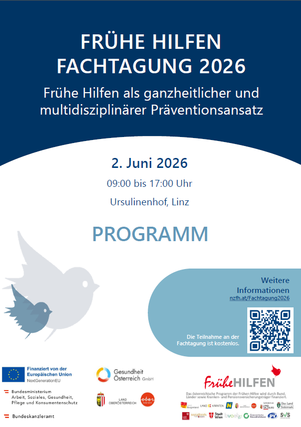 Am 2. Juni 2026 von 9.00 bis 17.00 findet in Linz (Ursulinenhof) unter dem Motto „Frühe Hilfen als ganzheitlicher und multidisziplinärer Präventionsansatz“ die ganztägige Frühe-Hilfen-Tagung 2026 statt. Die Tagung wird vom NZFH.at in Kooperation mit dem Land OÖ, dem BMASGPK und der Familiensektion des BKA organisiert. Die Tagung gibt Einblick in den aktuellen Stand der Umsetzung und die Praxis der Frühen Hilfen in Österreich und bietet zahlreiche Fachinputs sowie die Möglichkeit zur Vernetzung.